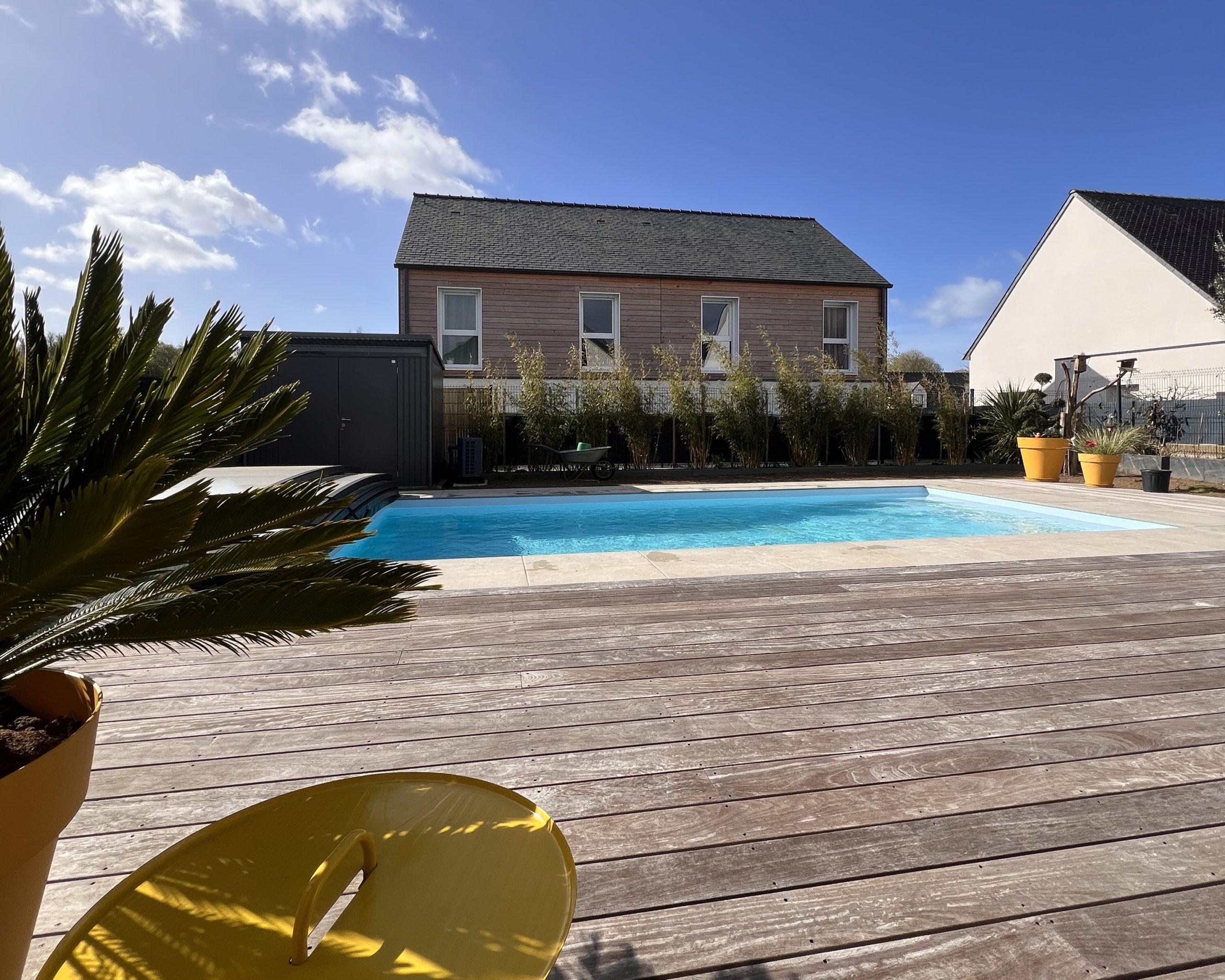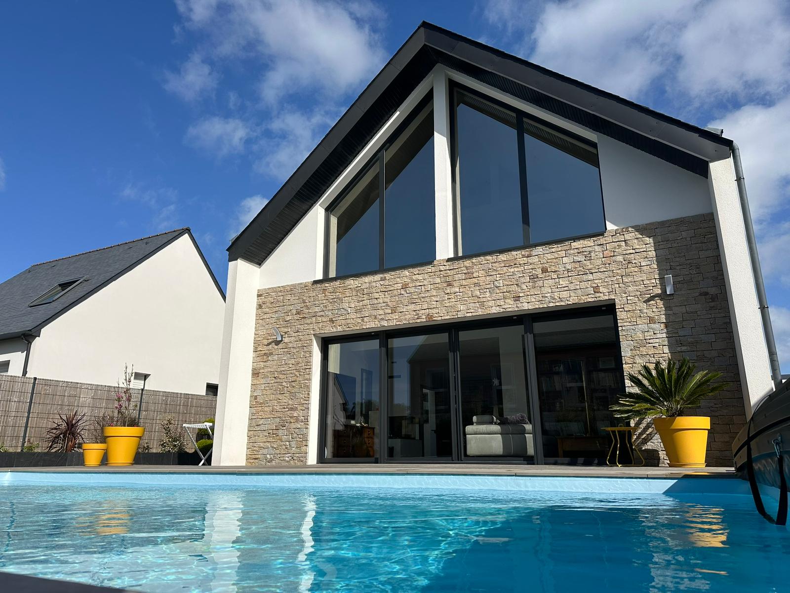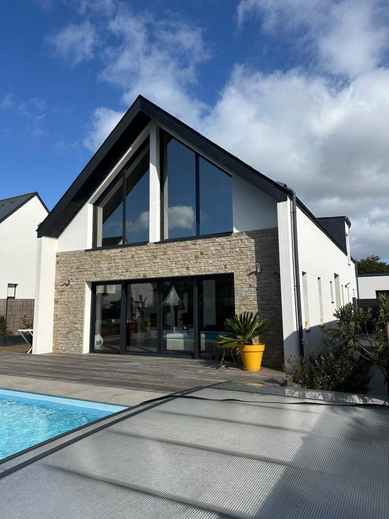 À l’extérieur, le parement en pierre apporte du caractère à l’ensemble, tandis que la terrasse bois et la piscine créent un cadre idéal pour profiter pleinement des beaux jours.