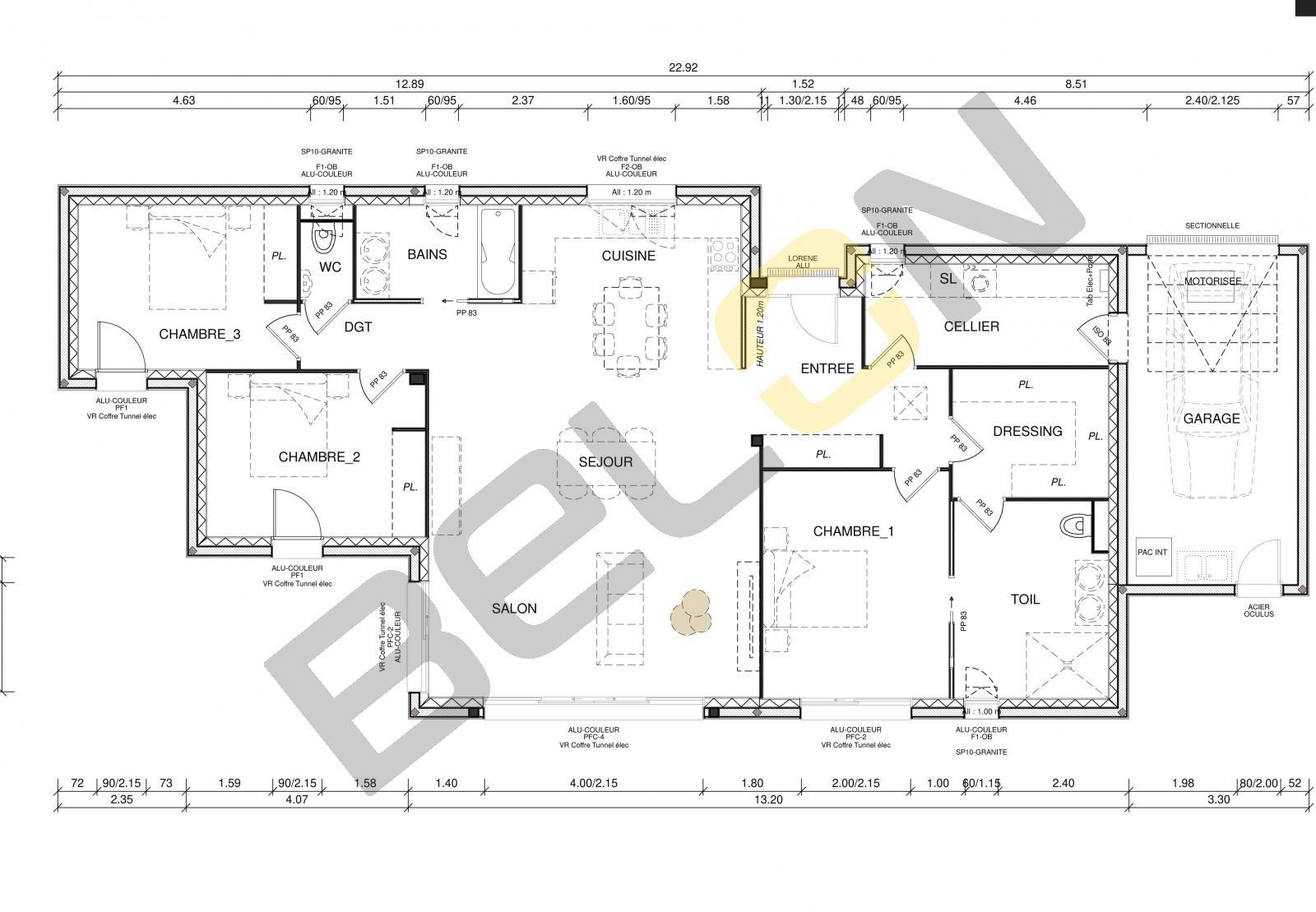 Plan de maison plain-pied - 131.38m² - 3 chambres